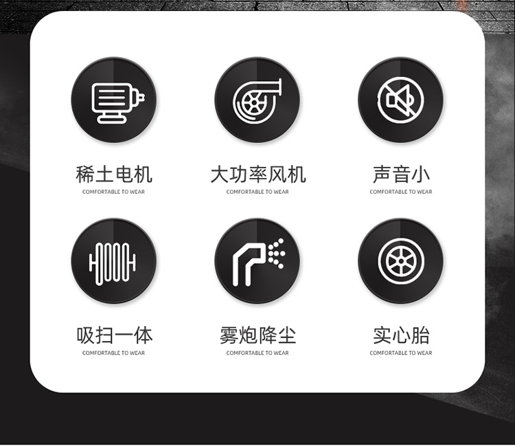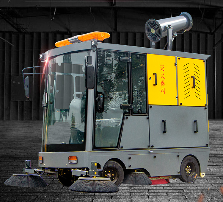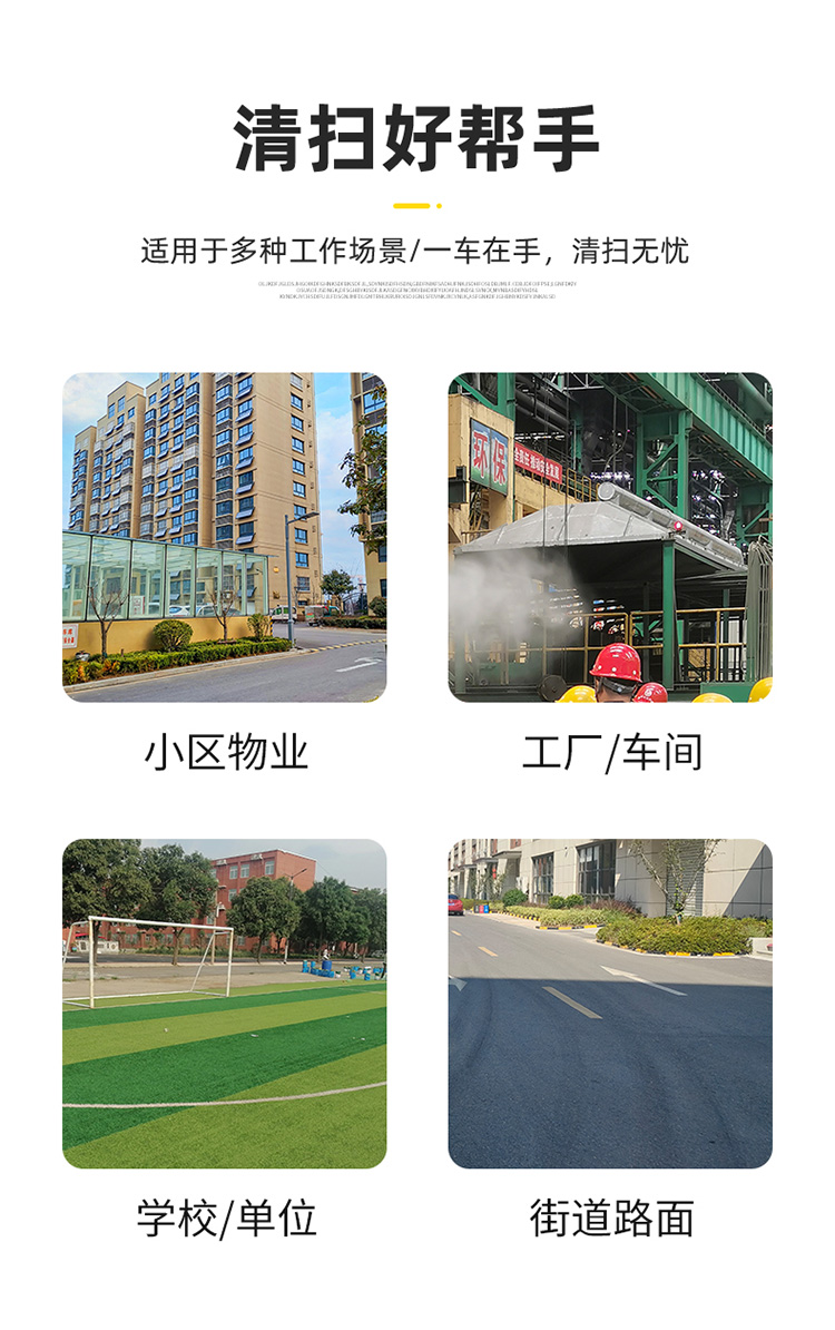 莱特LT-G23型,全封闭四轮驾驶式扫地车,配备高压清洗和高压雾炮功能,清扫宽度2300mm,满电工作时间为4-6小时,工作效率20000㎡/h,采用的是200A锂电池,高压雾炮射程可达10米以上,可对作业环境高效的降尘,还可以用于绿植养护和环境消杀。高压水枪可以对地面顽固污渍进行清洁,还可以冲洗路牙石,为绿植浇水,工作之余,还可以用高压水枪清洗车辆。应用场景为:厂区、车间、公园、街道、物业小区、码头、学校、机场等需要大面积清扫的区域区域。